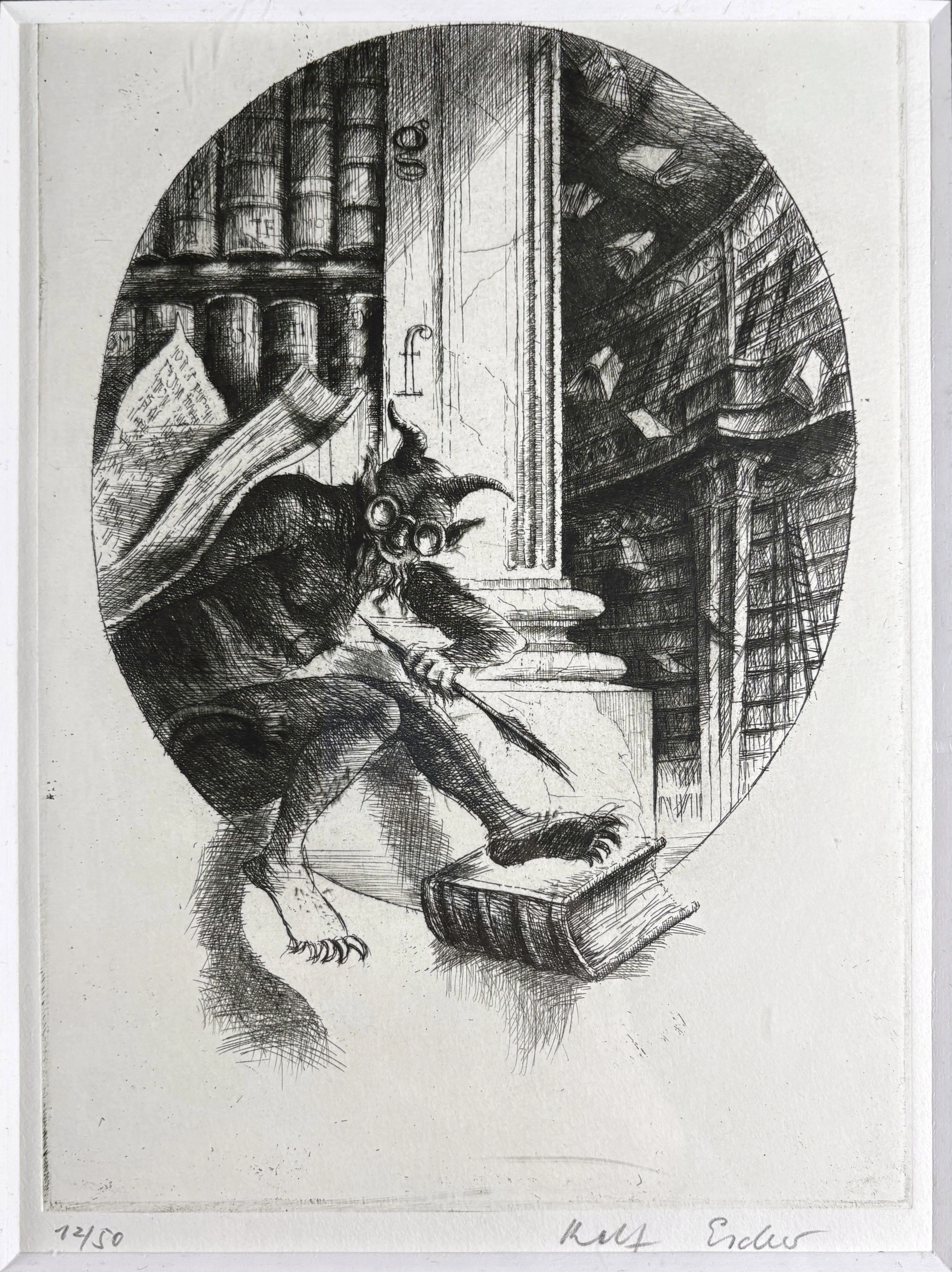 Now that my living room is gradually turning into a library, I’ve found a suitable etching by Rolf Escher (German) (*1936) (on artnet). ..
